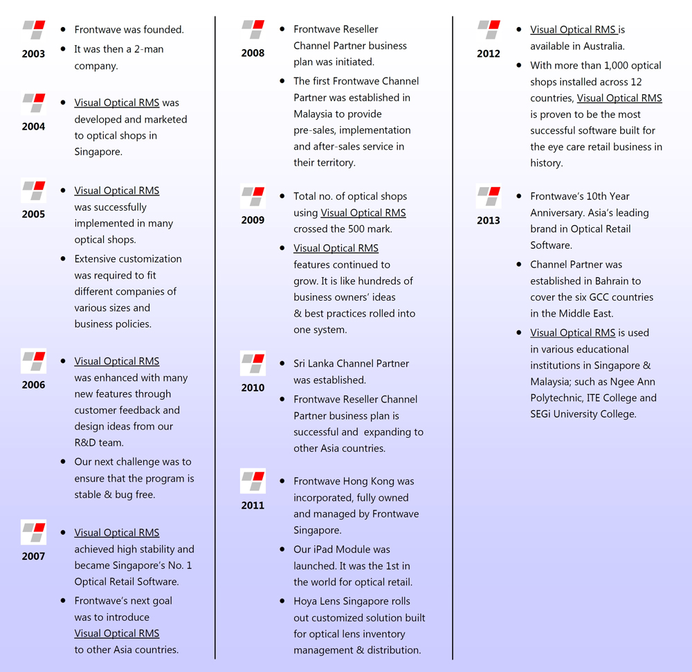 Frontwave was setup in early 2003 to serve the needs of Singapore's Business Industry. As an Independent Software Vendor (ISV), Frontwave specializes in providing Optical Practice Management solutions to eye care professionals & retailers across Asia. With more than 1,000 successful implementations, Visual Optical RMS is proven to be the most comprehensive solution for the eye care industry. In 2008, Frontwave started its Asia partner network program, which ensures that appointed distributors deliver personalized, local service in their territory; from pre-sales to implementation and after-sales support to meet clients’ needs.